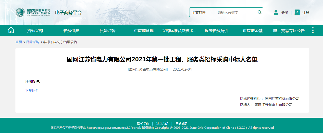 喜報:天津津海天源中標國網江蘇省電力有限公司2021年第一批工程、服務類招標采購項目